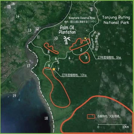 分断されたジュルンブンとハラパン村の森の間に植樹し森を再生する。